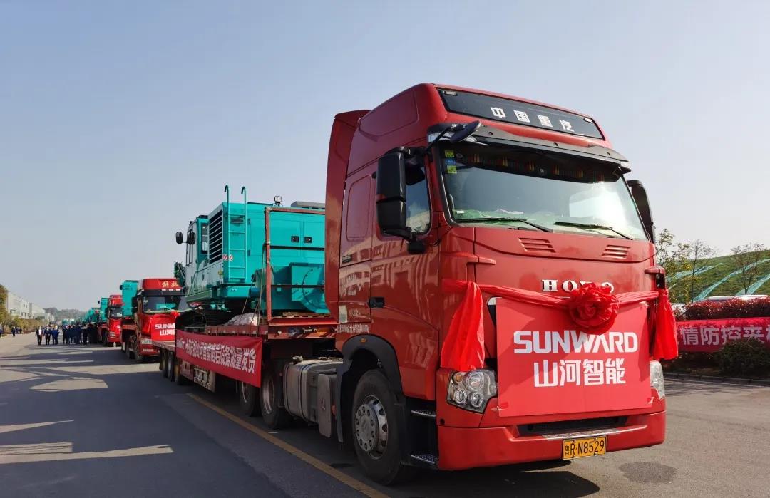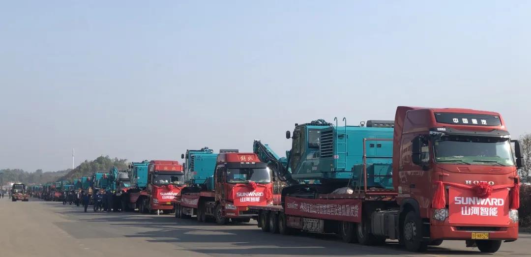抗疫情同舟共济,忙生产众志成城!2020年3月19日,山河工业城内一片喜庆景象,一大批凿岩与起重设备正在紧张装车,作为山河智能3月份新下线的装备,它们将批量发车,助力各地工程复工建设。