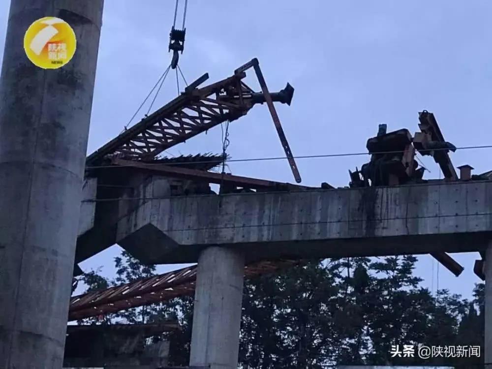 14时25分,架桥机吊挂1号梁橫移至2跨左幅1号位准备下降就位时,伴随着“咔嚓”响声,架桥机左前支腿钢筒支撑销轴突然脱落,左支撑钢筒回缩下沉,1号箱梁以箱梁几何重心为中心逆时针旋转,架桥机向右侧甩尾,带动架桥机右主梁桁架连同右前支腿前冲约5m脱离2号桥墩盖梁悬空坠落,左支撑钢筒断裂向右后方倾倒,架桥机瞬间倾覆解体。因主梁的旋转使吊载的1号梁后部与已就位的3号梁刮擦缠绕,1号梁将3号梁拽出桥墩盖梁一同坠落桥下在建的阳安铁路二线轨道上。解体后向右滚转倾翻的架桥机右主梁桁架前端将王俊霞、谭华军、崔高贤、姚笛、付永平、董炳红、季辉、王海涛、肖文9人砸中压在桥面上,齐辰鹏、胡长安、李航博3人在闪避中不同程度软组织擦伤。