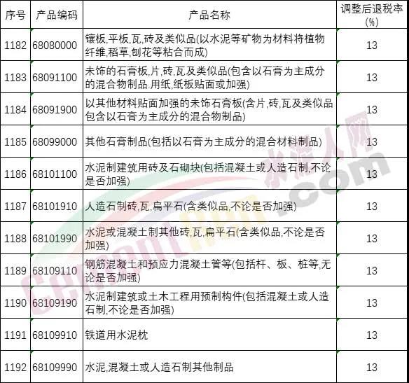 日前,国家财政部发布关于提高部分产品出口退税率的公告,提高出口退税率的产品清单中水泥,混凝土或人造石制其他制品等十余类产品调整后退税率为13%,相关类如下: