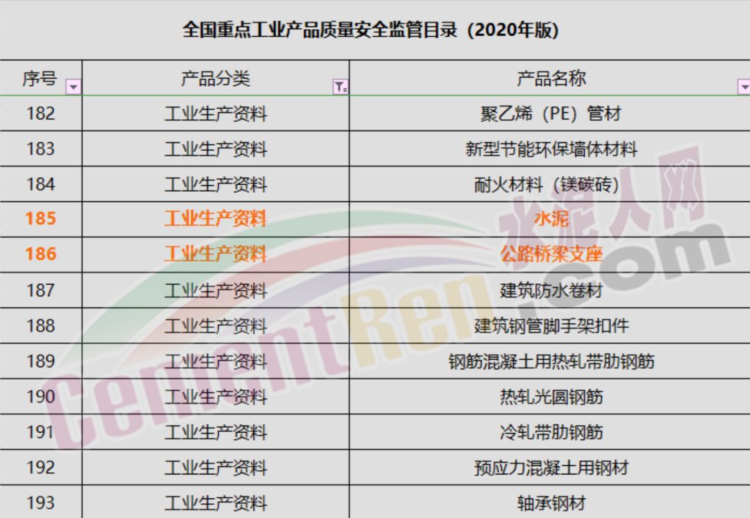3月17日,国家市场监督管理总局官网发布了《全国重点工业产品质量安全监管目录(2020年版)》文件,要求抓好流通领域重点产品质量安全监管。特别是针对风险高、已出现区域性或行业性质量安全问题苗头的产品,要及时开展专项整治,多措并举、综合施策、严控险情。水泥人网关注到,水泥、钢筋等重点建筑材料物资位列其中。