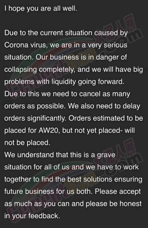 一家服务于 H&M, C&A, Gap, Walmart、Mango等时尚零售商的达卡(孟加拉国首都)服装出口商表示,中国市场对于服装和配饰的需求出现下滑;现在这一趋势开始在全球蔓延。该公司负责人 Siddiqur Rahman表示:“很多国家和地区都采取了封锁政策,现在谁还有买衣服的需求呢?”