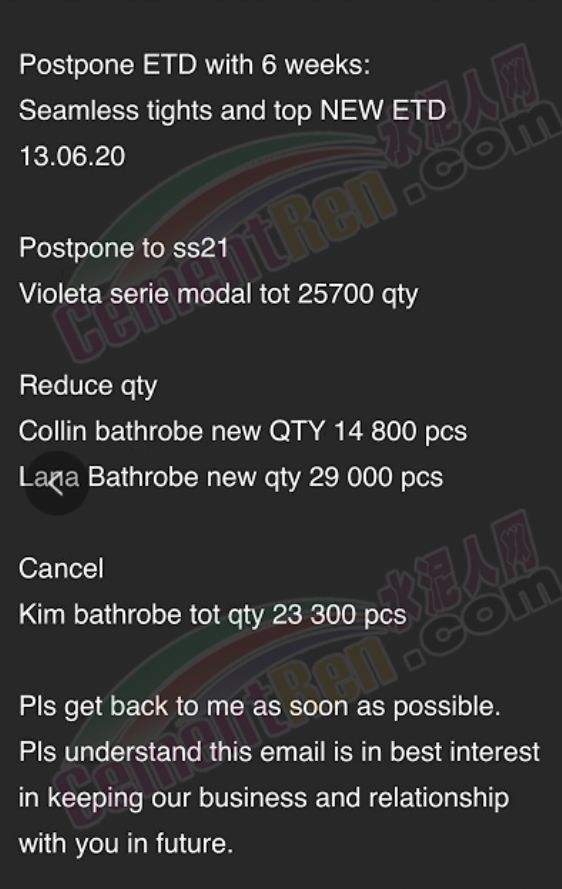 据孟加拉国服装生产商和出口协会(Bangladesh Garment Manufacturers and Exporters Association)负责人 Rubana Huq介绍,该国是仅次于中国的全球第二大服装生产国。目前,时尚品牌们在该国的订单削减量高达30%,有的则希望能获得一些订单折扣。