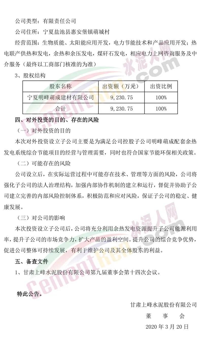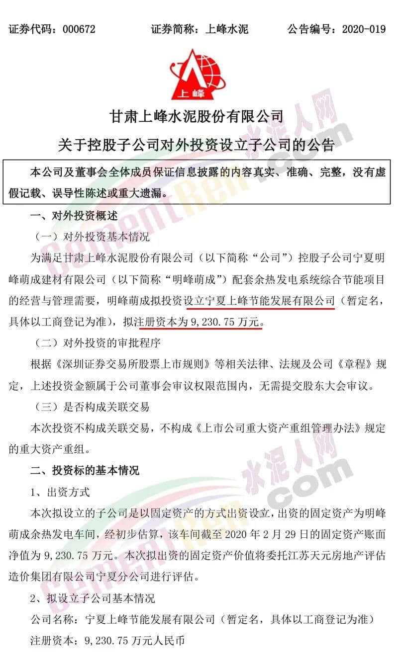 3月20日晚间,上峰水泥发布公告称,为满足公司控股子公司宁夏明峰萌成建材有限公司(以下简称“明峰萌成”)配套余热发电系统综合节能项目的经营与管理需要,明峰萌成拟以固定资产的方式出资设立宁夏上峰节能发展有限公司,拟注册资本为9230.75万元,出资的固定资产为明峰萌成余热发电车间。