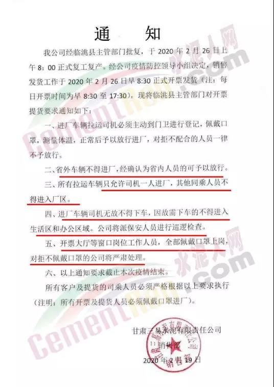 甘肃三易水泥有限责任公司此前发布通知称自2月26日上午8时正式复工,销售发货于早上8点30分正式开发票发货。且当地主管部门对开票提供提出了具体的要求。甘肃省外车辆不得进厂,经确认为省内人员的可予放行。
