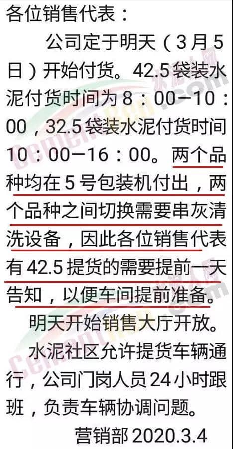 黑龙江某水泥企业通知3月5日起开始付货,42.5袋装及32.5袋装水泥两个品种均在5号包装机付出,两个品种之间切换需要串灰清洗设备,42.5水泥提供需要提前一天告知,以便车间提前准备。