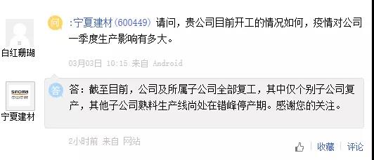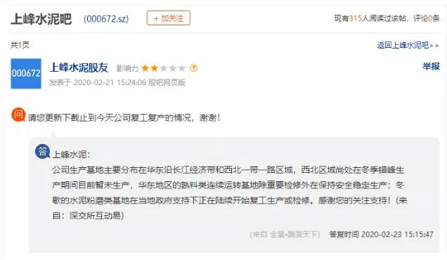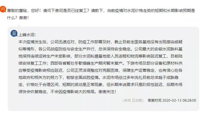近期水泥企业上市公司互动平台多有投资者询问,疫情对公司生产及销售的影响。