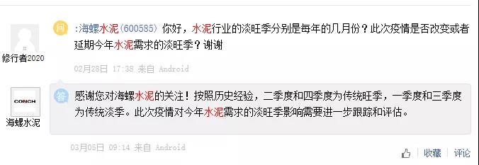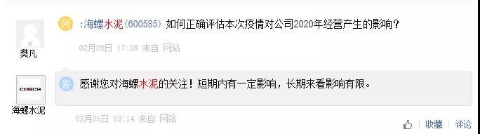 海螺水泥3月5日回复公司生产线已经陆续复工。疫情对企业2020年经营短期内有一定影响,长期来看影响有限。海螺水泥上市公司表示按照历史经验,二季度和四季度为传统旺季,一季度和三季度为传统淡季。此次疫情对今年水泥需求的淡旺季影响需要进一步跟踪和评估。