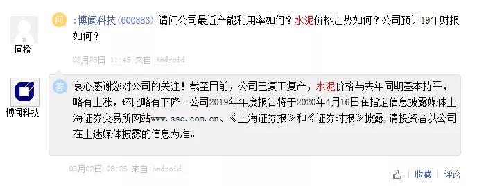 博闻科技(600883)3月2日回复截至目前,公司已复工复产,水泥价格与去年同期基本持平,略有上涨,环比略有下降。