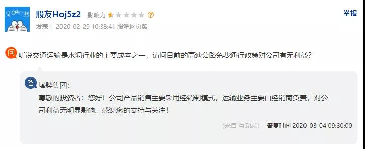 近期有有投资在上市公司平台提问称,听说交通运输是水泥行业的主要成本之一,目前的高速公路免费通行政策对塔牌公司有无利益?塔牌集团回复称,公司产品销售主要采用经销制模式,运输业务主要由经销商负责,对公司利益无明显影响。感谢您的支持与关注!