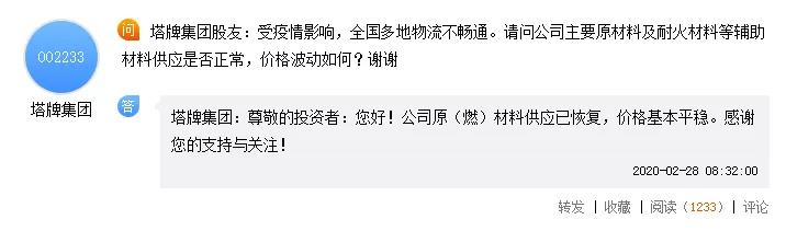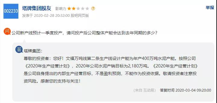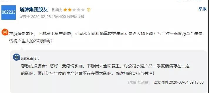 有投资者在上市公司平台向塔牌水泥提出,在疫情影响下,下游复工复产缓慢,公司水泥熟料销量较去年同期是否大幅下滑?预计对一季度乃至全年是否将产生大的不利影响等问题。董秘回复称,受疫情影响,下游尚未全面复工,对公司水泥产品一季度销售存在一定的影响,预计对全年度的生产经营不存在重大影响。