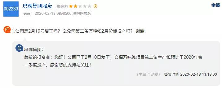 2月13日塔牌集团曾向股友表示,公司已于2月10日复工,企业设计产能为年产400万吨水泥人文福万吨线项目第二条生产线于1季度投产。按照公司《2020年生产经营计划》,2020年公司水泥产销目标为2,180万吨。
