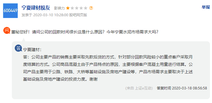 针对于近期的水泥市场需求,宁夏建材上市公司表示,公司主要产品的销售主要采取先款后货的方式,针对部分回款风险较小的重点客户采取月度结算的方式。公司商品混凝土由于产品特点的原因,主要根据客户混凝土用量进行结算。公司产品主要用于公路、铁路、大桥等基础设施及房地产建设等,产品市场需求主要取决于上述基础设施及房地产建设的投资力度。