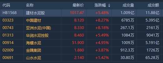随着各地陆续复工,西北、华东等地区水泥价格因需求修复率先上涨。青海、宁夏等地区的水泥企业近期将水泥价格上调20元/吨至65元/吨,浙江台州、温州等地也将水泥价格上调10元/吨。水泥股全线走强。 截至发稿,中国建材(03323)涨8.27%,报8.12港元;亚洲水泥(中国)(00743)涨8.05%,报8.32港元;华润水泥控股(01313)涨5.36%,报8.46港元;海螺水泥(600585,股吧)(00914)涨4.95%,报51.9港元。