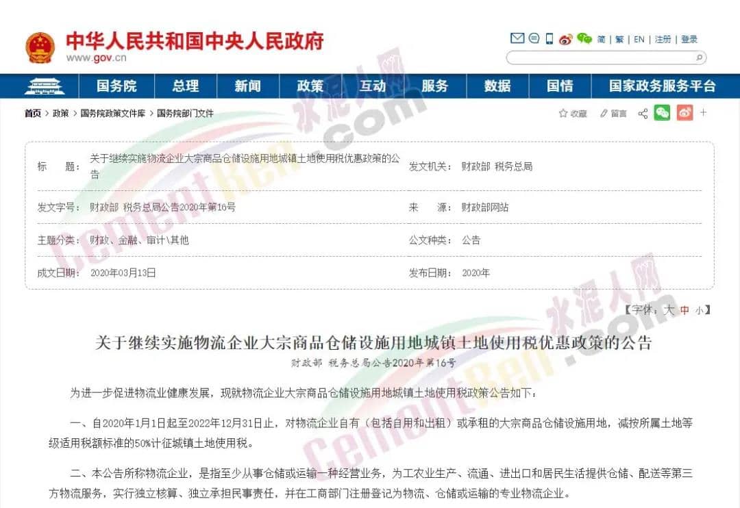 公告称,自2020年1月1日起至2022年12月31日止,对物流企业自有(包括自用和出租)或承租的大宗商品仓储设施用地,减按所属土地等级适用税额标准的50%计征城镇土地使用税。