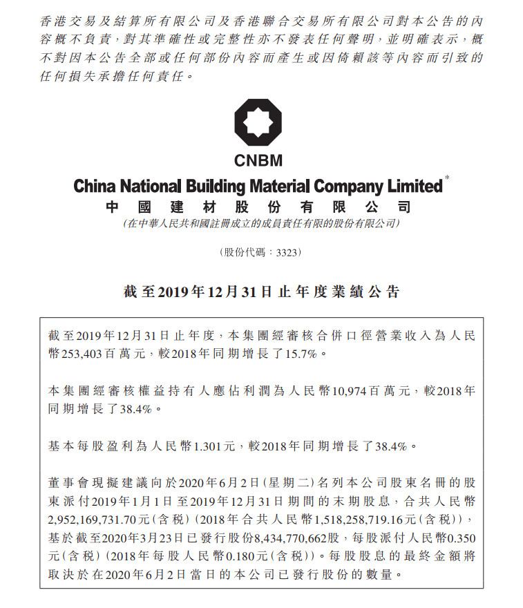 中国建材(03323)公布,截至去年12月31日止年度纯利按年升38.4%,至约109.74亿元(人民币。下同),每股盈利1.301元,派末期股息每股35分。