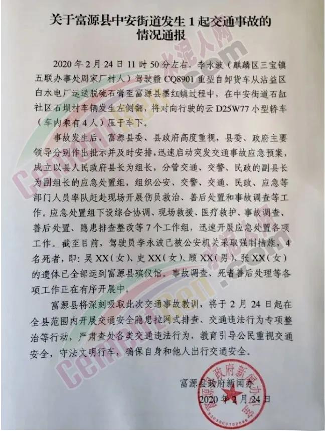 事故发生后,富源县委、县政府高度重视,县委、政府主要领导分别作出批示并及时安排,迅速启动突发交通事故应急预案成立以县人民政府县长为组长,分管交通、交警、民政的副县长为副组长的应急处置组,组织公安、交警、交通、民政、应急等部门人员率队赶赴现场开展伤员救治、善后处置和事故调查等工作。应急处置组下设综合协调、现场救援、医疗救护、事故调查、善后处置、隐患排査整改等7个工作组,迅速开展应急处置各项工作。截至目前,驾驶员李永波已被公安机关采取强制措施,4名死者,即:吴XX(女)、史XX(女)、顾XX(男)、张XX(女)的遗体全部运到富源县殡仪馆。
