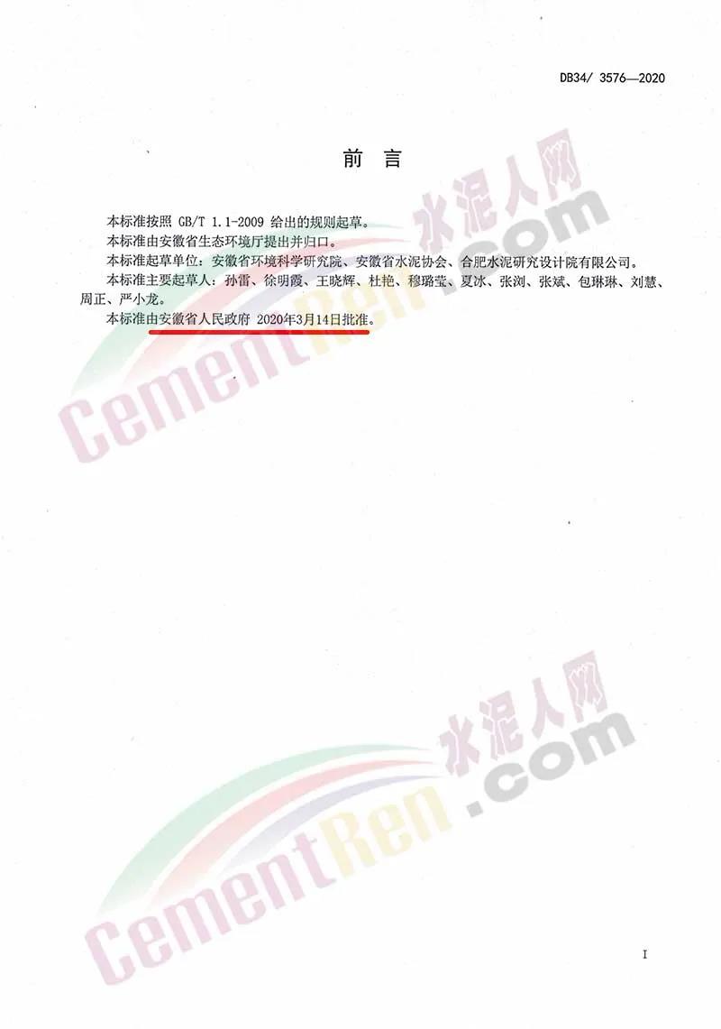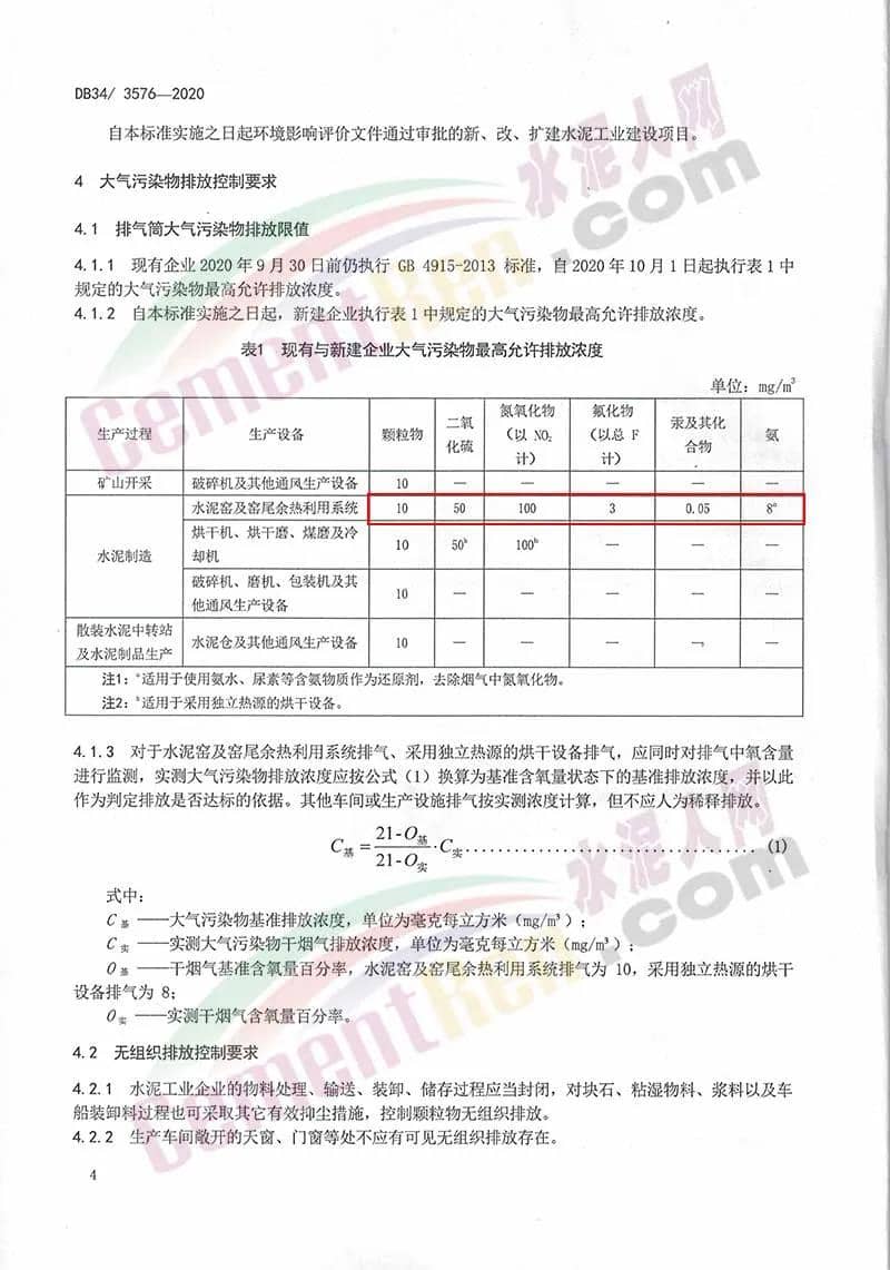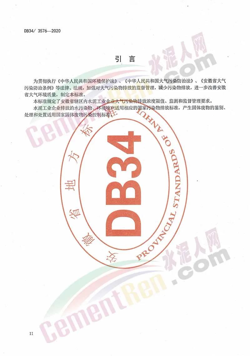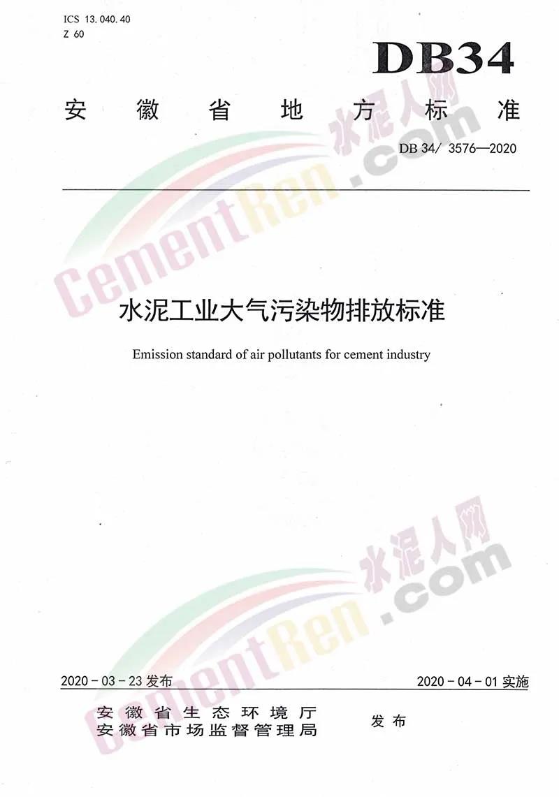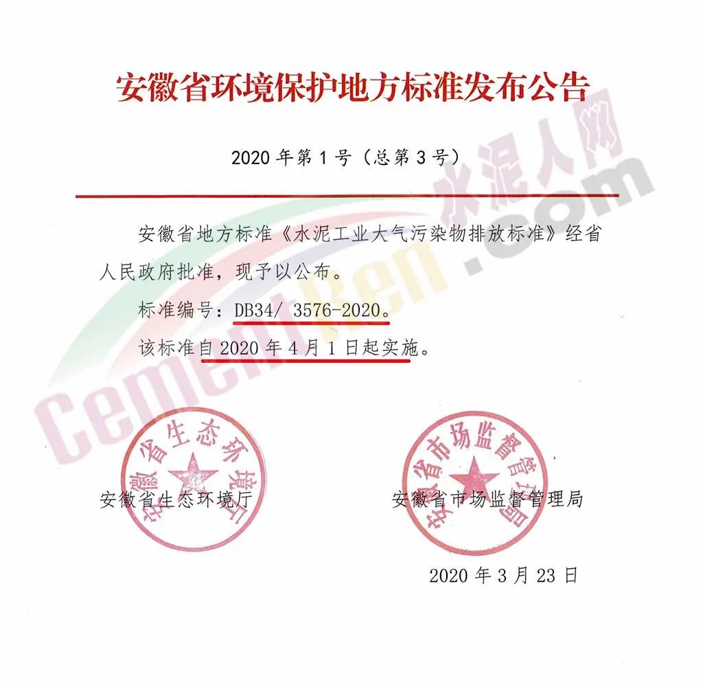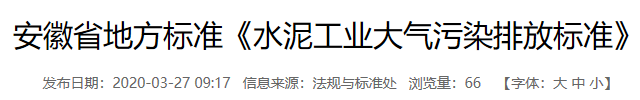 为助力打赢蓝天保卫战,加严重点行业污染物排放标准,安徽省生态环境厅牵头制定《标准》。据介绍,《标准》适用于现有水泥工业企业或生产设施的大气污染物排放管理,以及水泥工业建设项目的环境影响评价、环境保护设施设计、竣工环境保护设施验收、排污许可及其投产后的大气污染物排放管理。《标准》规定,有组织排放的颗粒物、二氧化硫和氮氧化物分别为10、50、100mg/m3,为目前执行的国标特别排放限值的50%、50%、31.2%(国标要求颗粒物、二氧化硫和氮氧化物分别为20、100、320mg/m3),氟化物、氨、汞及其化合物分别为3、8、0.05mg/m3,与国标要求一致。