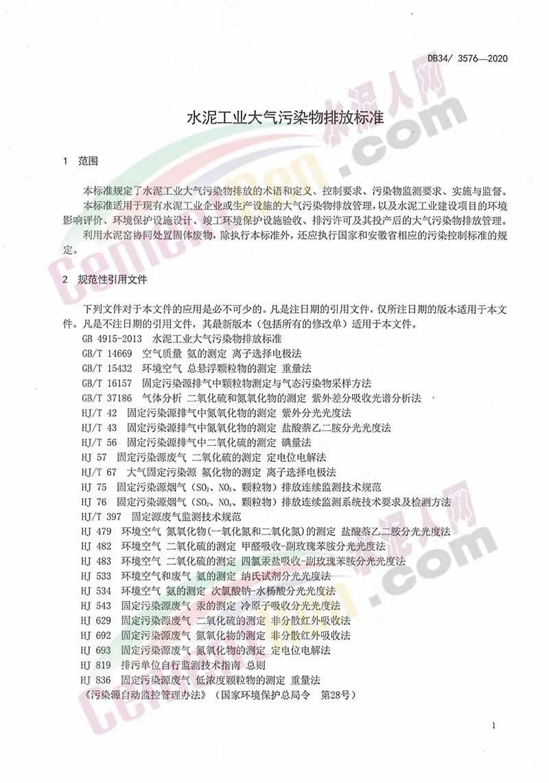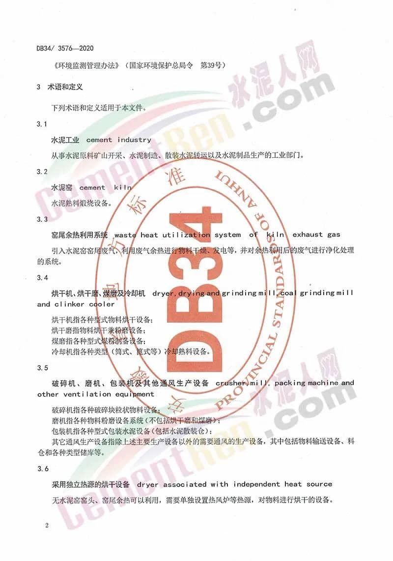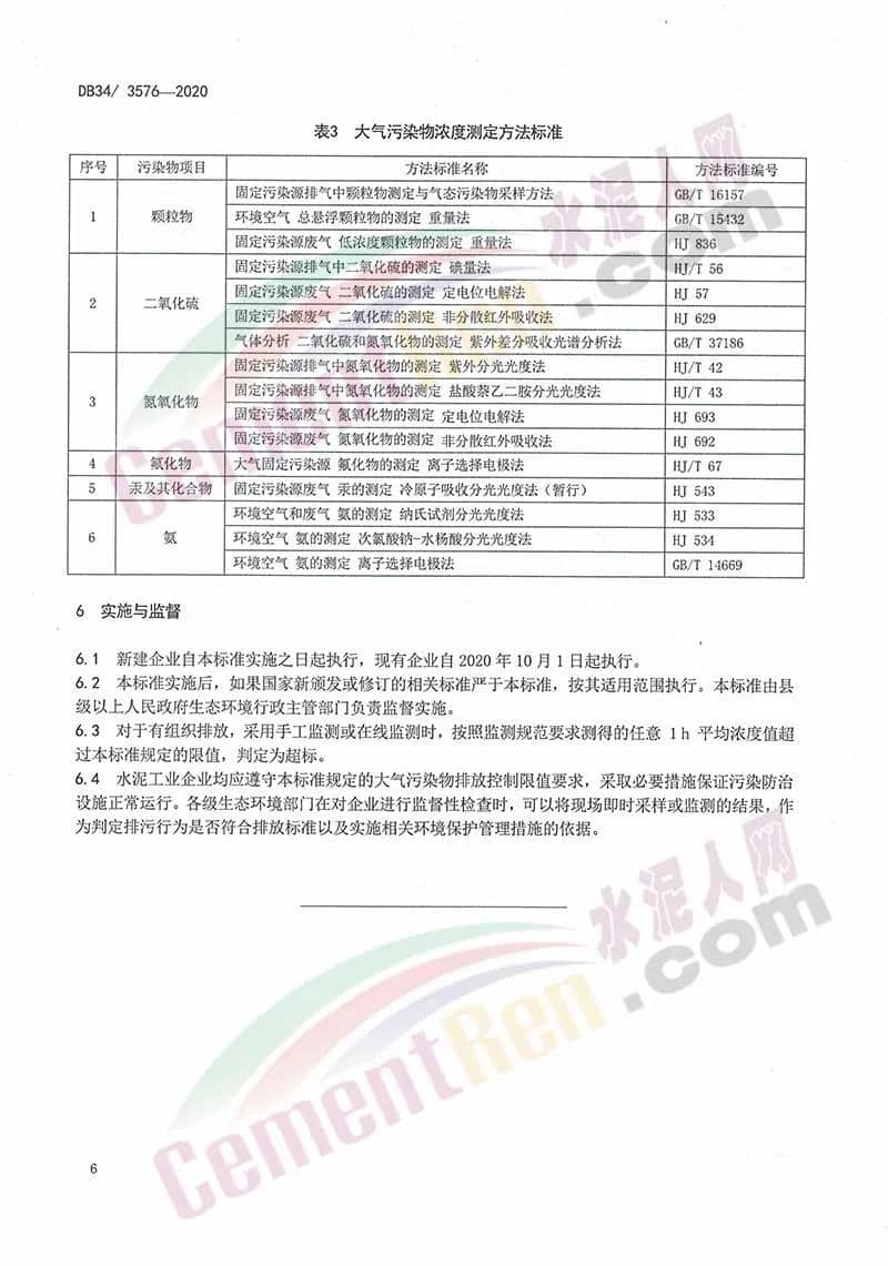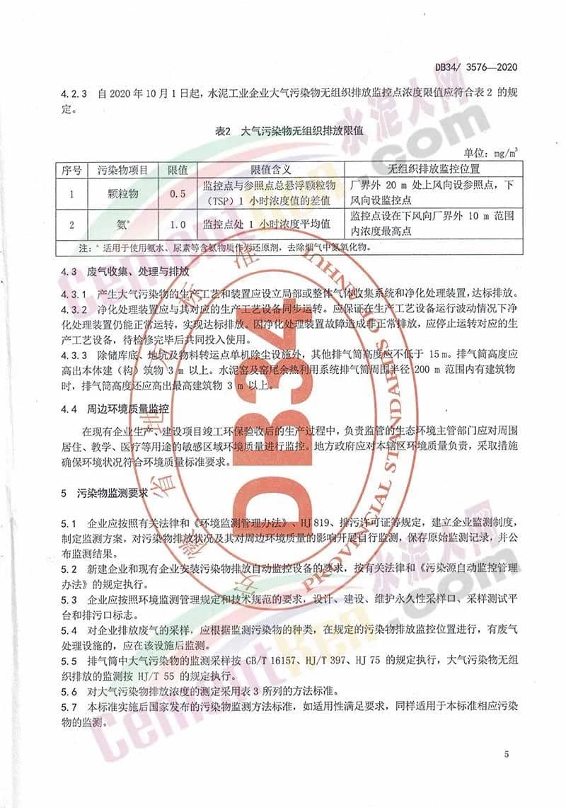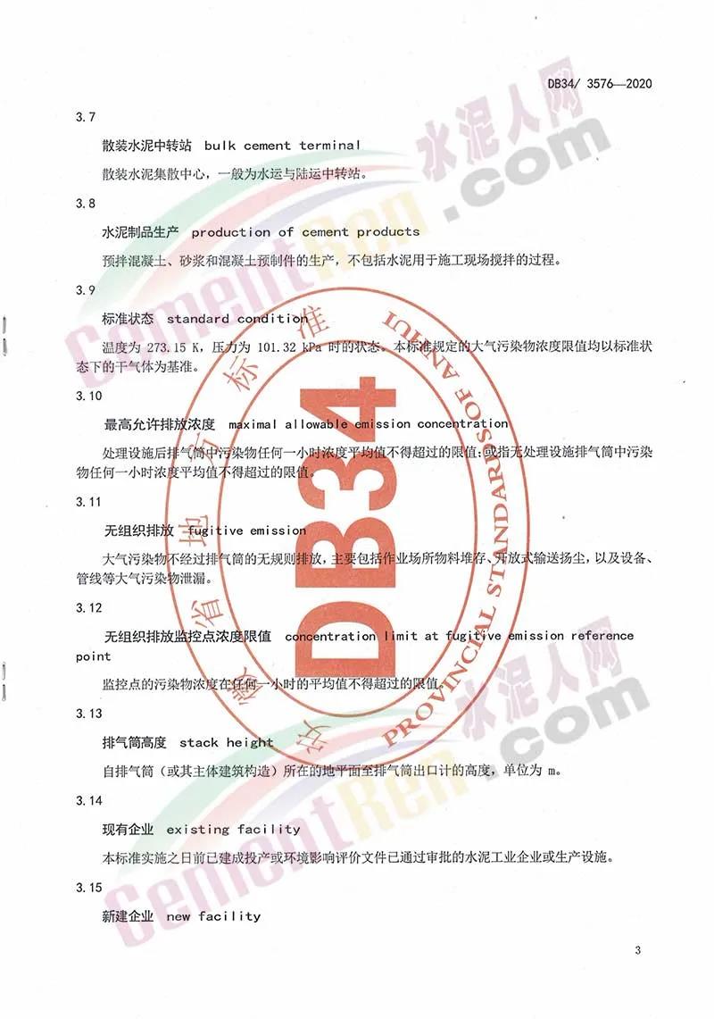 为助力打赢蓝天保卫战,加严重点行业污染物排放标准,安徽省生态环境厅牵头制定《标准》。据介绍,《标准》适用于现有水泥工业企业或生产设施的大气污染物排放管理,以及水泥工业建设项目的环境影响评价、环境保护设施设计、竣工环境保护设施验收、排污许可及其投产后的大气污染物排放管理。《标准》规定,有组织排放的颗粒物、二氧化硫和氮氧化物分别为10、50、100mg/m3,为目前执行的国标特别排放限值的50%、50%、31.2%(国标要求颗粒物、二氧化硫和氮氧化物分别为20、100、320mg/m3),氟化物、氨、汞及其化合物分别为3、8、0.05mg/m3,与国标要求一致。