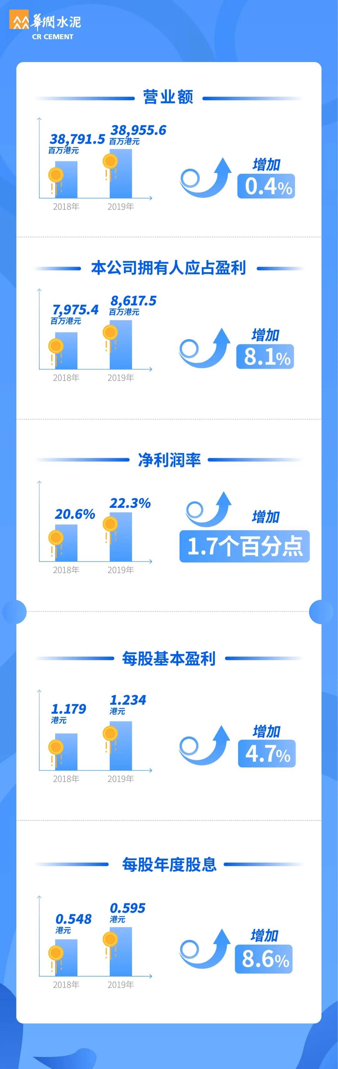 3月27日,华润水泥发布2019年全年业绩。2019年本公司拥有人应占盈利增加8.1%至86.2亿港元,创历史新高;全年派息59.5港仙、派息率达48.2%。公司立足华南、稳中求进,推动转型创新,积极探索产业链延伸的机会,在骨料、装配式建筑及人造石材等新业务方面均取得突破。