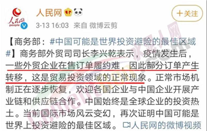 其实,早在中国疫情最严重的时候,由于外贸企业停工,无法按期交付订单,已经导致部分订单转移到了其它国家。国家商务部门也注意到这个问题,并表示这是正常的现象。