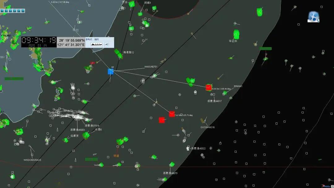 VTS利用电子巡航在温岭三蒜岛附近水域锁定福建北上内河船,信息通报现场执法行动组。