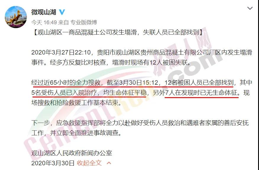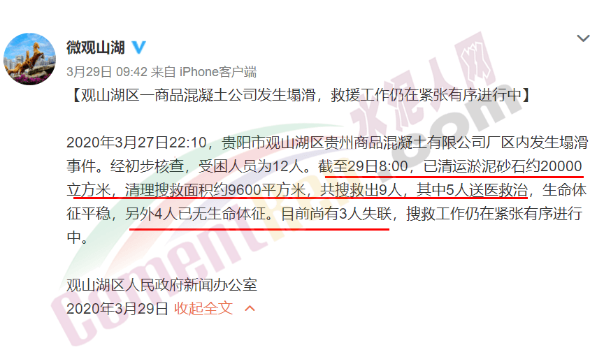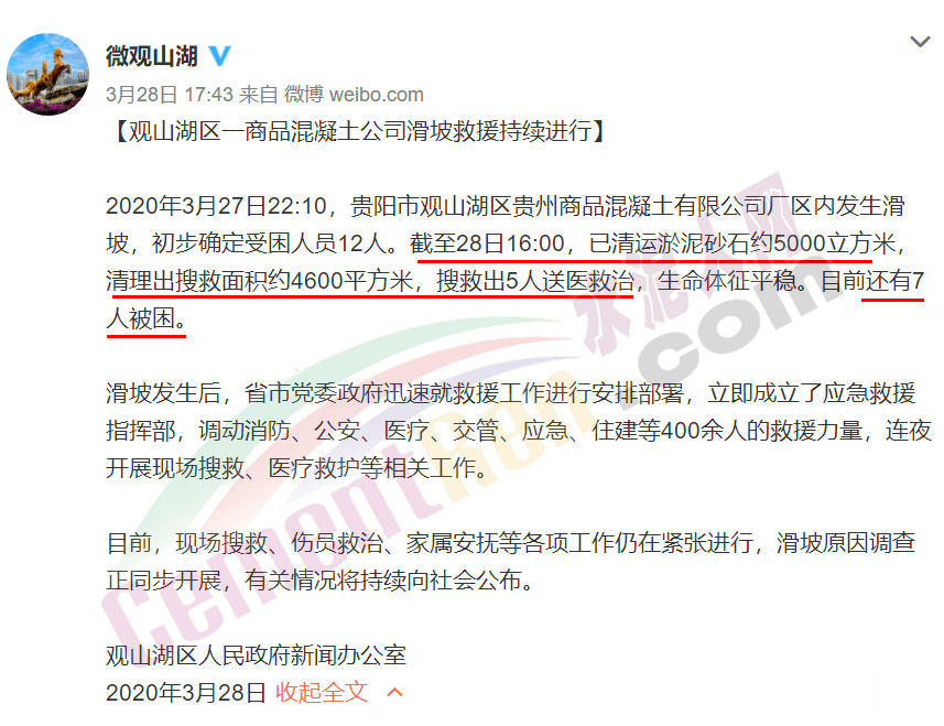 据贵阳市观山湖区委宣传部官方微博3月30日消息,2020年3月27日22:10,贵阳市观山湖区贵州商品混凝土有限公司厂区内发生塌滑事件。经多方反复比对核查,塌滑时现场有12人被困失联。