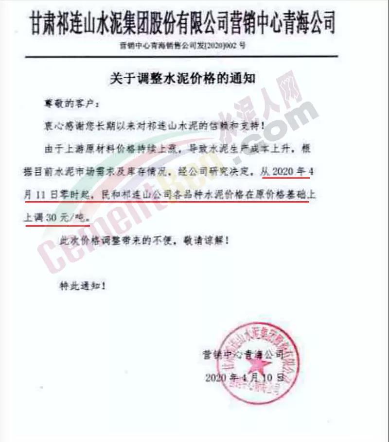 甘肃三易水泥有限责任公司调价通知称,受疫情影响,致使公司生产原材料及运输成本大幅度增涨,经公司研究决定自4月16日零时起,对公司所生产的各品种水泥在现有价格基础上上调30元/吨。