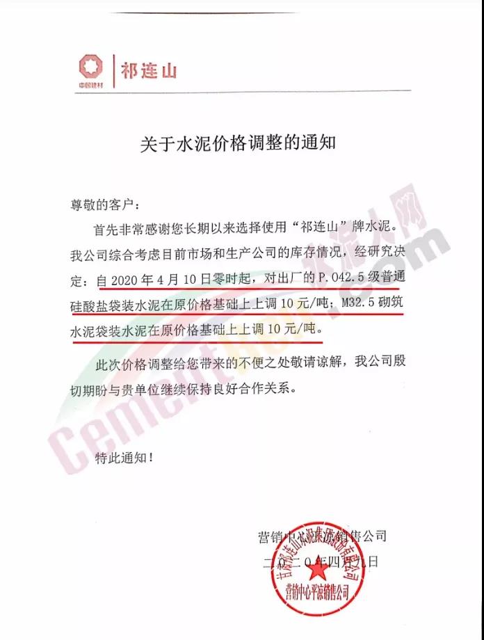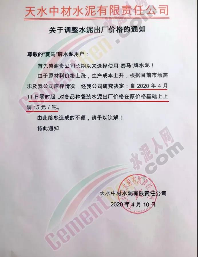 4月7日河南同力水泥通知:因省各水泥线错峰停产、环保提升成本增加,经公司研究决定:从2020年4月7日8:30点起,各品种袋、散水泥均上涨20元/吨。