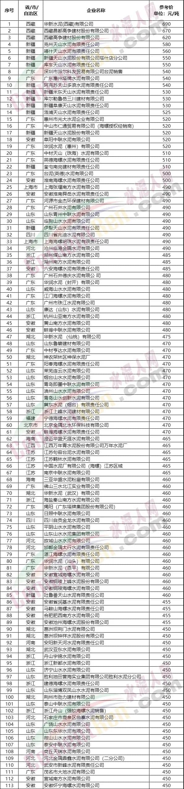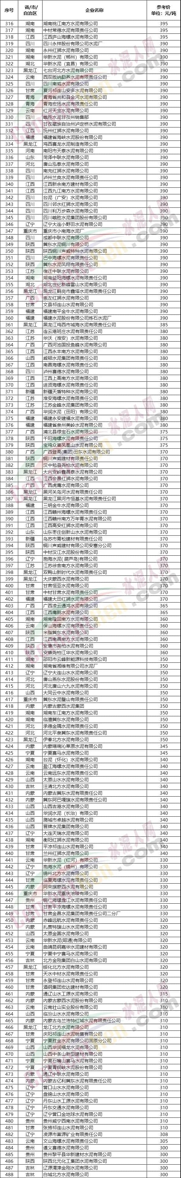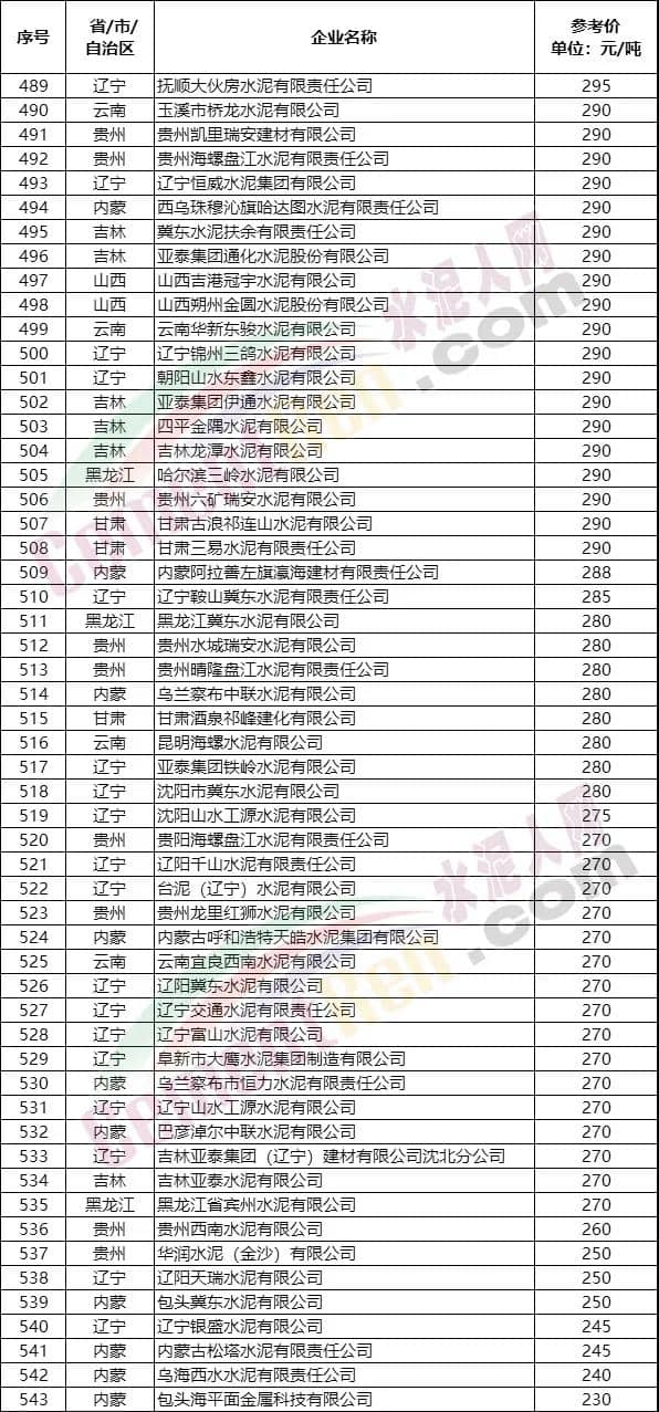 *注:上述数据来源于水泥人网信息中心人工采集,仅供参考,如与实际成交价格不符,请以实际成交价格为准。