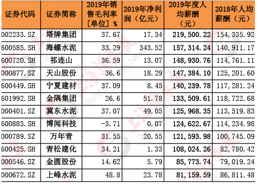 以海螺水泥为例,2019年净利润超过340亿元,销售毛利率超过33%。水涨船高,海螺水泥高管的薪水去年也普遍上调20万元-30万元不等,年薪大都超过了150万元。