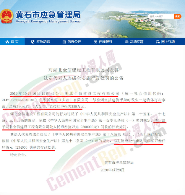 事故相关企业华新水泥(大冶)有限公司、湖北全信建设工程有限公司的行为违反了《中华人民共和国安全生产法》相关条款规定对上述公司及主要负责人总经理、法人做出相应的处罚。