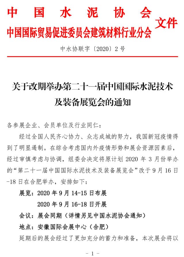 经过全国人民齐心协力、众志成城的努力,我国新冠疫情得到了明显遏制。在综合考虑国内外疫情形势和展会资源因素后,经过审慎考虑与协调,组委会决定将原计划 2020 年 3 月份举办的“第二十一届中国国际水泥技术及装备展览会”改于 9 月 16 日 -18 日在合肥举办,安排如下:
