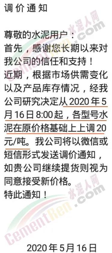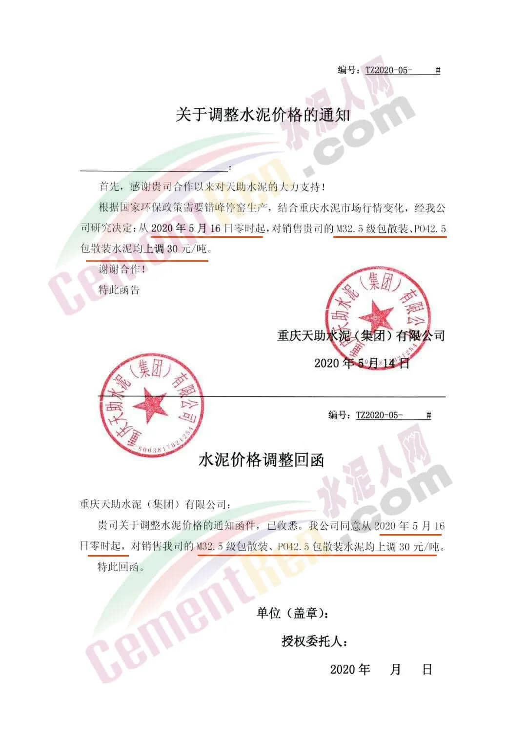 重庆天助水泥(集团)有限公司通知根据国家环保政策需要错峰停窑,结合 重庆水泥市场行情变化,经公司研究决定从5月16日零时起,对M32.5级PO42.5级包装和散装水泥价格上调30元/吨。