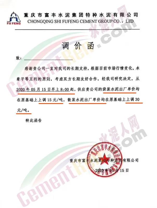 重庆市富丰水泥集团特种水泥有限公司通知,根据目前市场行情变化 ,经公司研究决定从5月15日早8时起,袋装水泥出厂价上调15元/吨,散装水泥出厂价上调30元/吨。