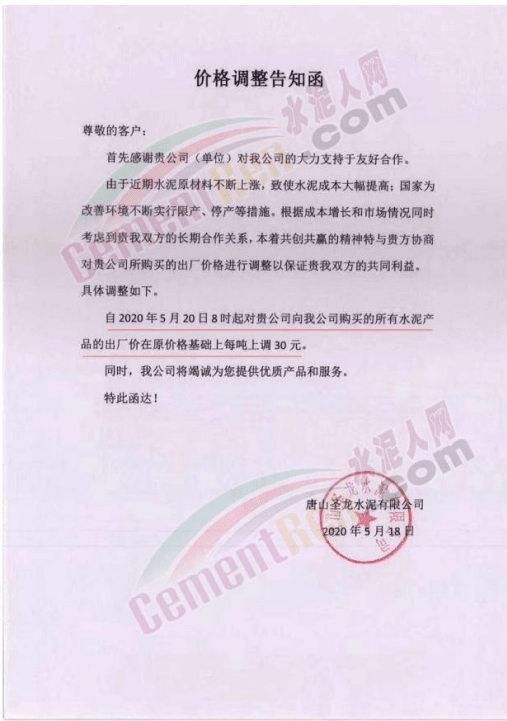 5月18日,唐山圣龙水泥有限公司通知,根据市场变化情况,国家为改善环境不断实行限产、停产等措施,自2020年5月20日8时起所有水泥产品的出厂价格在原价格基础上每吨上调30元。
