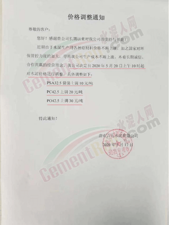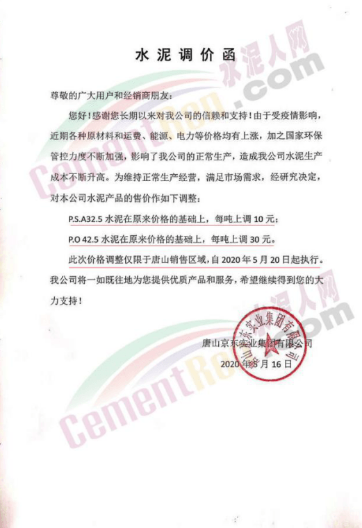 5月16日,唐山京东实业集团有限公司通知,根据市场变化情况,自2020年5月20日起,P.S.A32.5水泥在原来价格的基础上,每吨上调10元,P.O42.5水泥在原来价格的基础上,每吨上调30元。