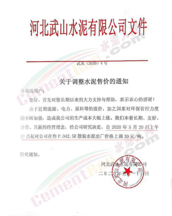 5月16日,河北武山水泥有限公司通知,根据市场变化情况,能源、电力、原料等的涨价,自2020年5月20日上午10点起,P.042.5R散装水泥出厂价格上调30元/吨。
