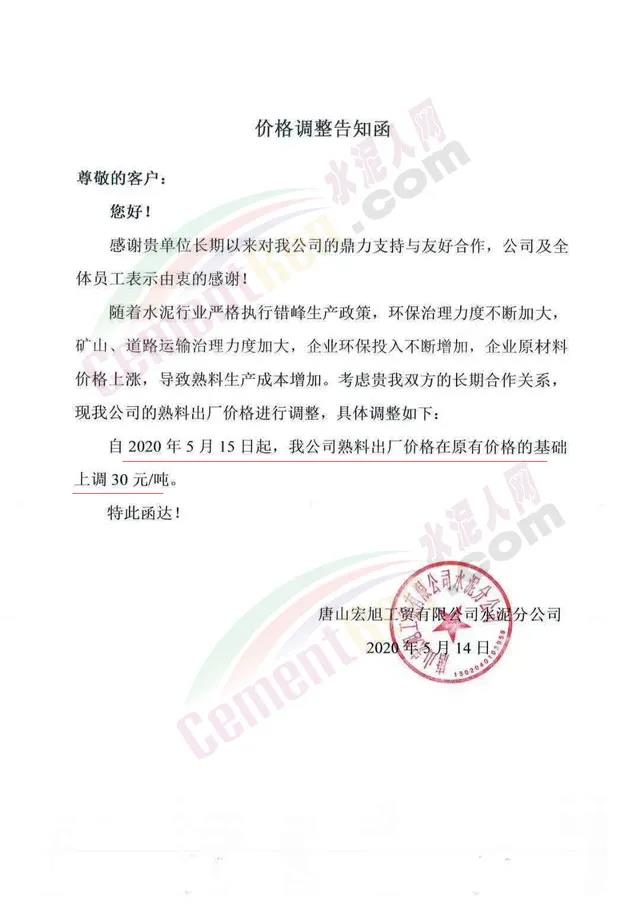 5月14日,唐山宏旭工贸有限公司水泥分公司发布通知称:随着水泥行业严格执行错峰生产政策,环保治理力度不断加大,矿山、道路运输治理力度加大,企业环保投入不断增加,企业原材料价格上涨,导致熟料生产成本增加。自2020年5月15日起,水泥出厂价格在原有价格的基础上调30元/吨。