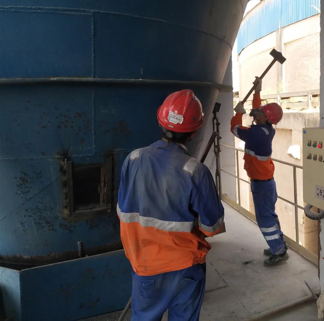 清库前,大家制定好安全监管制度、应急预案,在作业现场认真做了风险评估,办理作业许可,严格按照LOTOTO程序9步骤进行了操作,对库外边堆料区域进行警示隔离。由于清库作业属于高风险作业,为了降低风险,大家轮番作业,先使用大锤从库锥钢板仓外部进行敲击,使用长钢钎、架管从库顶测量孔、下料口对库壁物料进行清理,清除松动物料。然后系上安全带站在梯子上,用风镐对挂壁顽固的物料进行清理,库内物料清下来后顺着库下边的外接溜子输送到外边空地上。在清库现场,大家充分发扬吃苦耐劳、精诚团结的工作作风,经过4天的共同努力,顺利地完成了两个库的清料任务。生料系统清库工作的顺利完成,不仅让大家积累了清库作业经验,同时为后期生产的稳定运行奠定了坚实基础。
