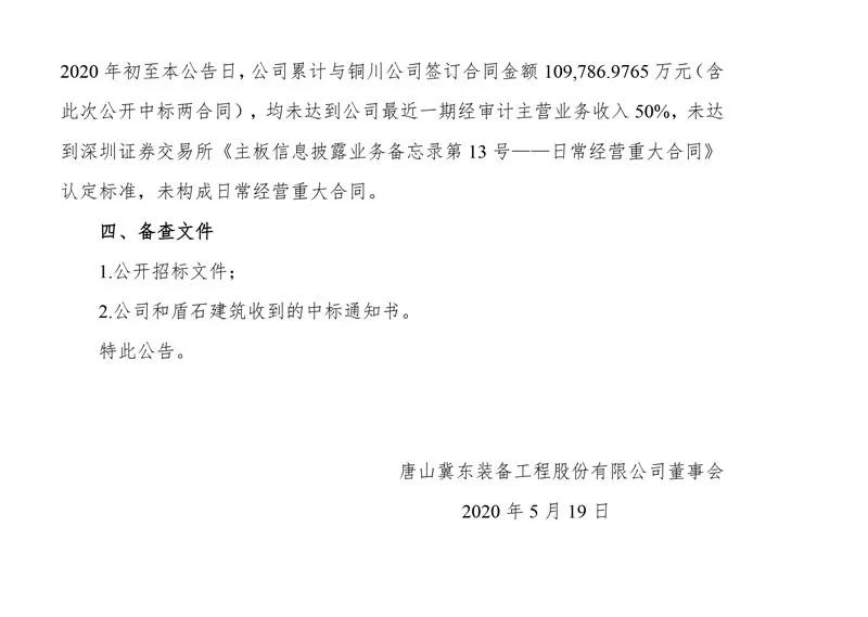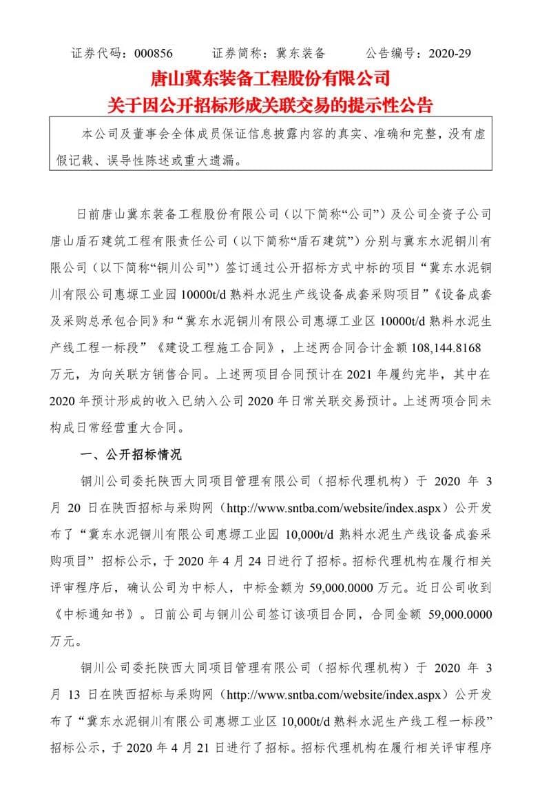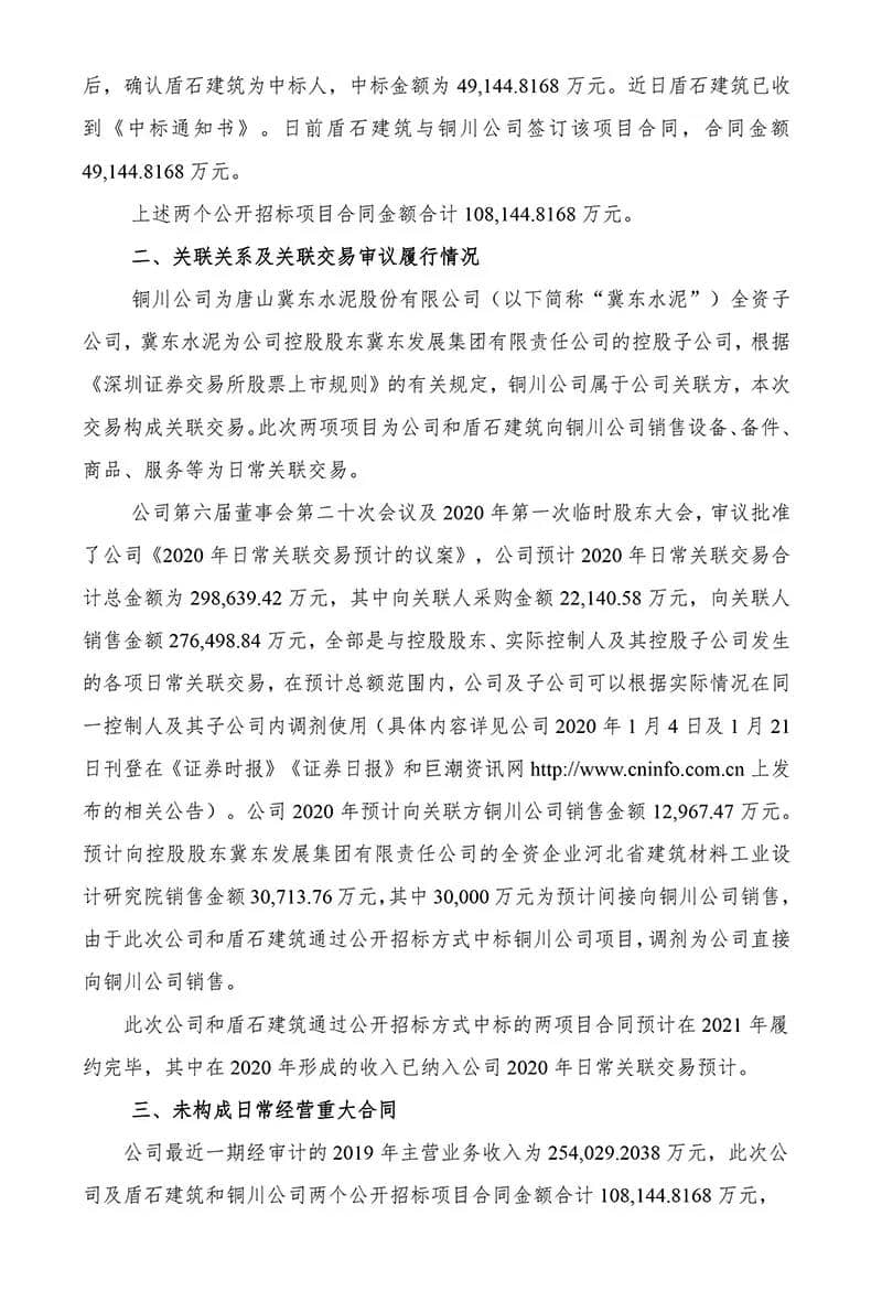 冀东装备公布,日前公司及公司全资子公司唐山盾石建筑工程有限责任公司(“盾石建筑”)分别与冀东水泥铜川有限公司签订通过公开招标方式中标的项目“冀东水泥铜川有限公司惠塬工业园10000t/d熟料水泥生产线设备成套采购项目”《设备成套及采购总承包合同》和“冀东水泥铜川有限公司惠塬工业区10000t/d熟料水泥生产线工程一标段”《建设工程施工合同》,上述两合同合计金额10.81亿元,为向关联方销售合同。上述两项目合同预计在2021年履约完毕,其中在2020年预计形成的收入已纳入公司2020年日常关联交易预计。 资料图:冀东水泥 (来源:上市企业公告)