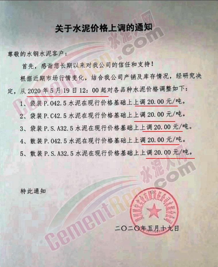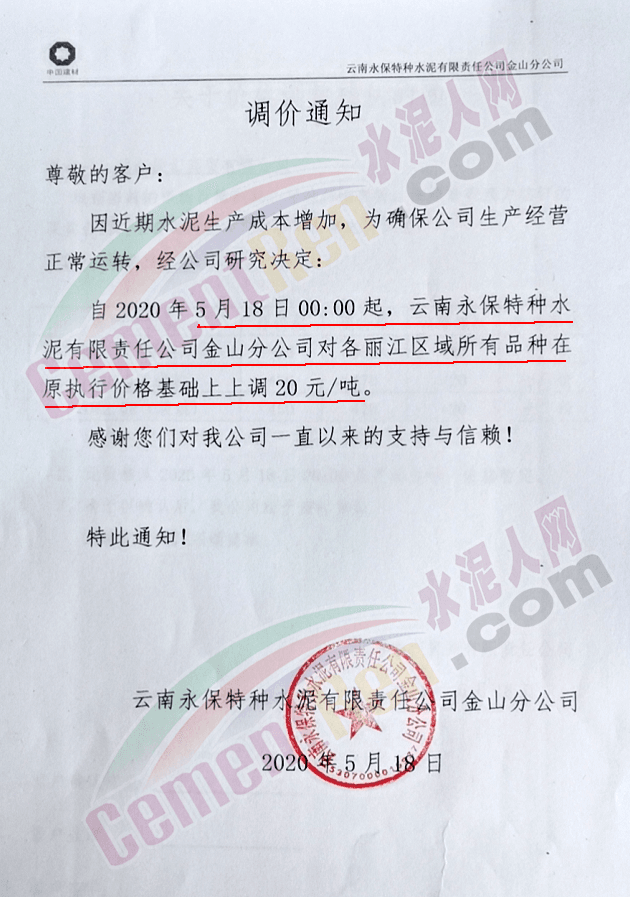 云南永保特种水泥有限责任公司金山分公司通知因近期水泥生产成本增加,为确保公司生产经营正常运转,经公司研究决定 ,自5月18日0时起,云南永保特种水泥有限责任公司金山分公司对各丽江区域所有品种在原执行价格基础上上调20元/吨。