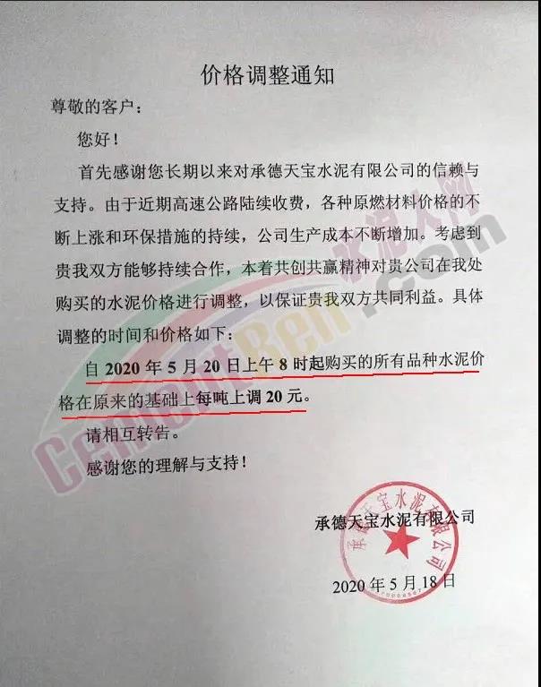 承德天宝水泥有限公司通知,由于近期高速公路陆续收费,各种原燃材料价格不断上涨和环保措施的持续,公司生产成本不断增加。自5月20日上午8时起所有品种水泥价格在原来的基础上上调20元/吨。