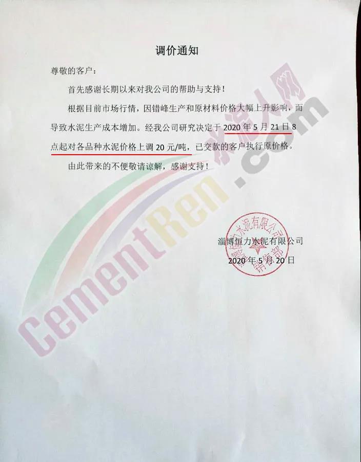 水泥人网通讯员消息:昨日(20日)淄博恒力水泥有限公司通知,根据目前市场行情,因错峰生产和原材料价格大幅上升影响,导致水泥生产成本增加。经公司研究决定于今日(5月21日)8时起对各品种水泥价格上调20元/吨。