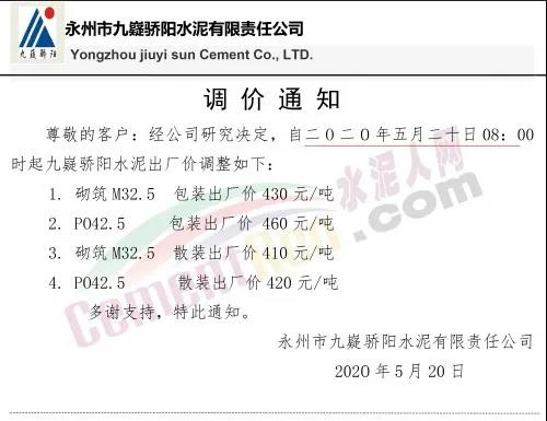 据水泥人网了解,近两日,湖南区域多家企业也有通知上调水泥价格,20日湖南永州市九嶷骄阳水泥有限责任公司通知自5月20日8时起调整出厂价格。调整后各标号水泥出厂价如下: