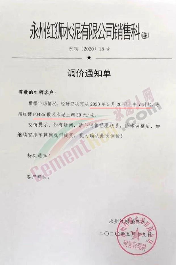 19日,永州红狮水泥有限公司销售科通知,从5月20日上午7时起PO42.5散装水泥上调30元/吨。