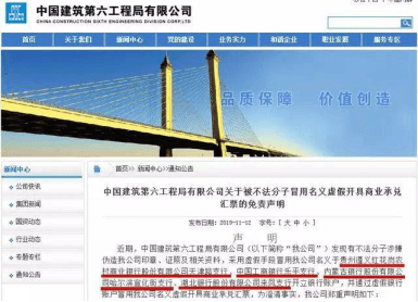 中国建筑第六工程局有限公司关于被不法分子冒用名义虚假开具商业承兑汇票的免责声明近期,中国建筑第六工程局有限公司(以下简称“我公司”)发现有不法分子涉嫌伪造我公司印章、证照及相关资料,采用虚假手段冒用我公司名义于贵州遵义红花岗农村商业银行股份有限公司天津路支行、中国工商银行乐平支行、内蒙古银行股份有限公司哈尔滨宣化街支行、湖北银行股份有限公司来凤支行开立银行账户,并通过虚假银行账户冒用我公司名义虚假开具商业承兑汇票。