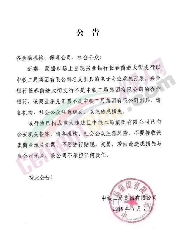 对此中铁二局集团有限公司紧急发布公告,对这批假承兑汇票情况进行了官方说明: