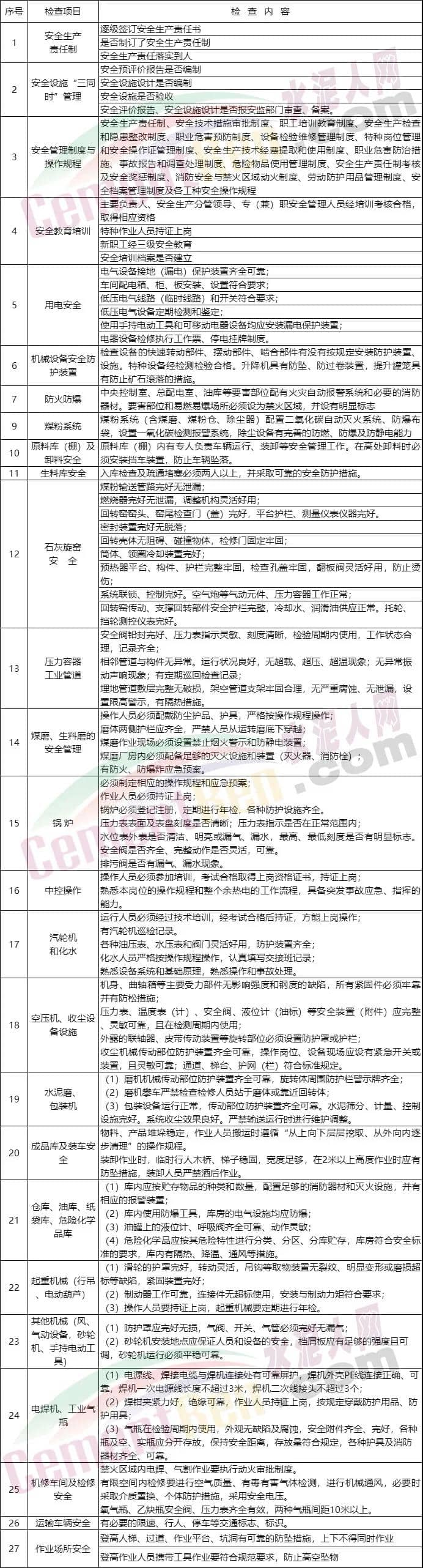 对于水泥行业,安全检查都查些什么,一直以来都各行业从业人士,甚至检查员们关注的大事。水泥生产工艺和工序复杂多样, 由于安全防护措施不到位、违章作业等原因,水泥企业安全事故多发,事故类型多样化。水泥筒形库清库、预热器清堵、篦冷机“打雪人”、预分解点火和投料、磨机和窑炉系统检维修、协同处置废物等作业过程,常发生坍塌、火灾、窒息、中毒、灼烫、高处坠落、车辆伤害、机械伤害等各类事故伤害。水泥工厂煤磨系统、燃油储罐、脱硝系统等重点区域,易发生火灾、爆炸等严重事故伤害。水泥生产安全不容忽视,每一个细节都关乎水泥人的生命和健康。