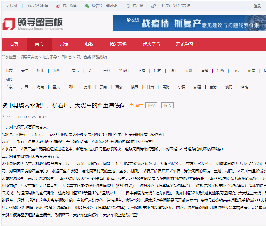其留言称,四川省星船城水泥公司、天鹰水泥公司、东方红水泥公司以及周边大大小小的采石厂矿石厂企业负责人在司机材料运输过程中严重失职,并且对公共设施的破坏!几乎所有水泥厂和所有矿石厂没有督促大货车司机,大货车在运输过程中对国道321(资中县段),对归沙路(渔溪镇至铁佛镇段),对板铺路(板栗娅至新桥镇段)造成的噪声扰民、空气扰民,对道路周围的空气污染,对国道321等道路的严重破坏!