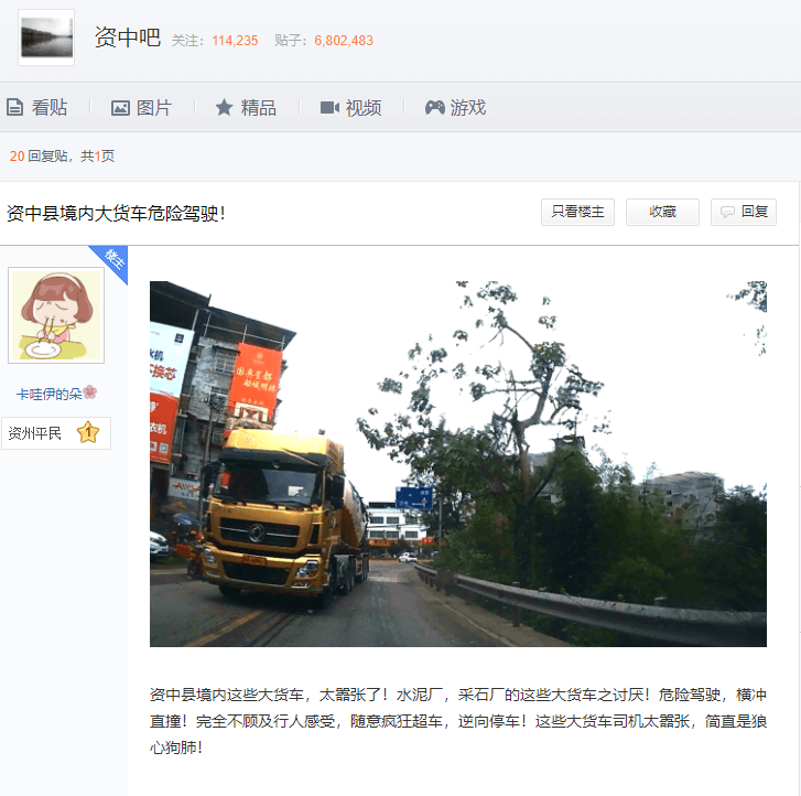 百度“资中吧”中一网友表示“资中县境内这些大货车,太嚣张了!水泥厂,采石厂的这些大货车之讨厌!危险驾驶,横冲直撞!完全不顾及行人感受,随意疯狂超车,逆向停车!这些大货车司机太嚣张,简直是狼心狗肺!”